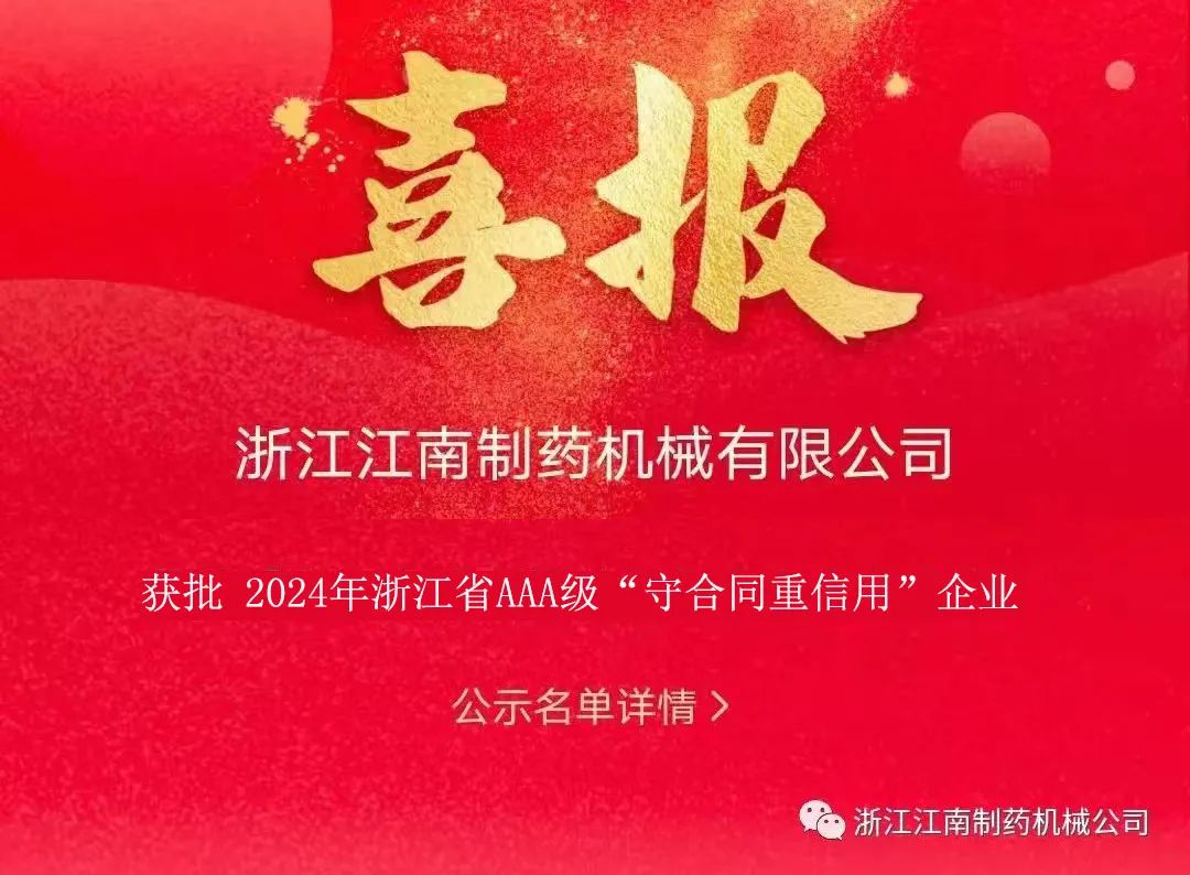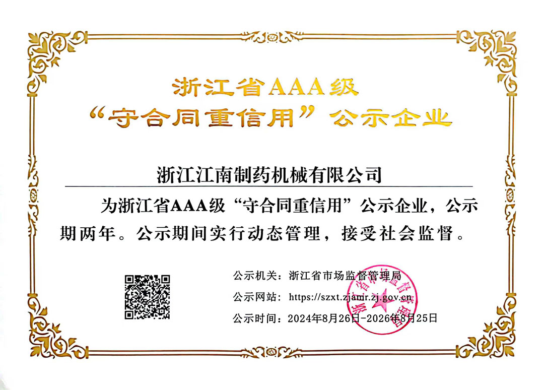 Zhejiang Jiangnan Company has been awarded the AAA-level "Contract-abiding and Credit-worthy" enterprise honor, which is an affirmation of the company's past efforts and an encouragement for future development. The company will continue to strengthen contract management, improve the level of integrity, provide customers with better services, and contribute to the healthy development of the pharmaceutical packaging machinery industry.
