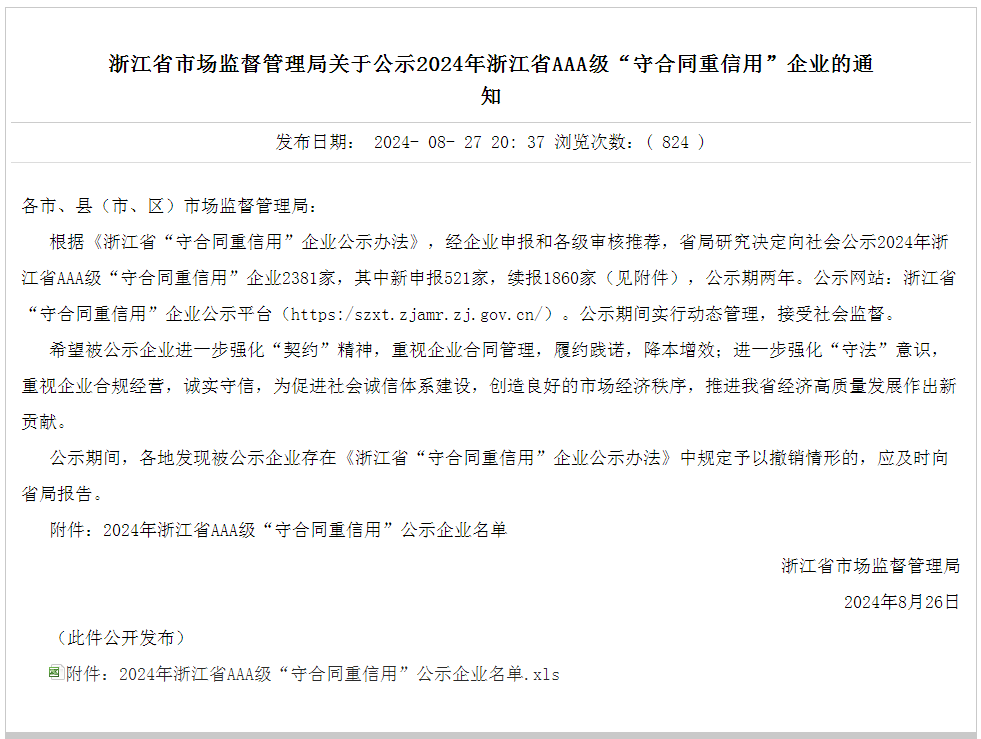 Zhejiang Jiangnan Company has received good news. After strict application and review, the company successfully won the title of Zhejiang Province AAA-level "Contract-abiding and Credit-worthy" Enterprise in 2024. This is a high recognition of Zhejiang Jiangnan's long-term adherence to honest management and standardized management.